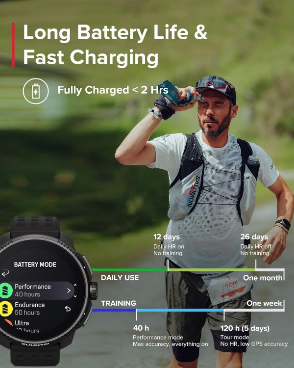 LONG BATTERY LIFE - 40 hours of battery life in the most accurate tracking mode, which can be extended to 120 hours in tour mode. Can last up to 10 days in daily mode with 24/7 tracking of heart rate